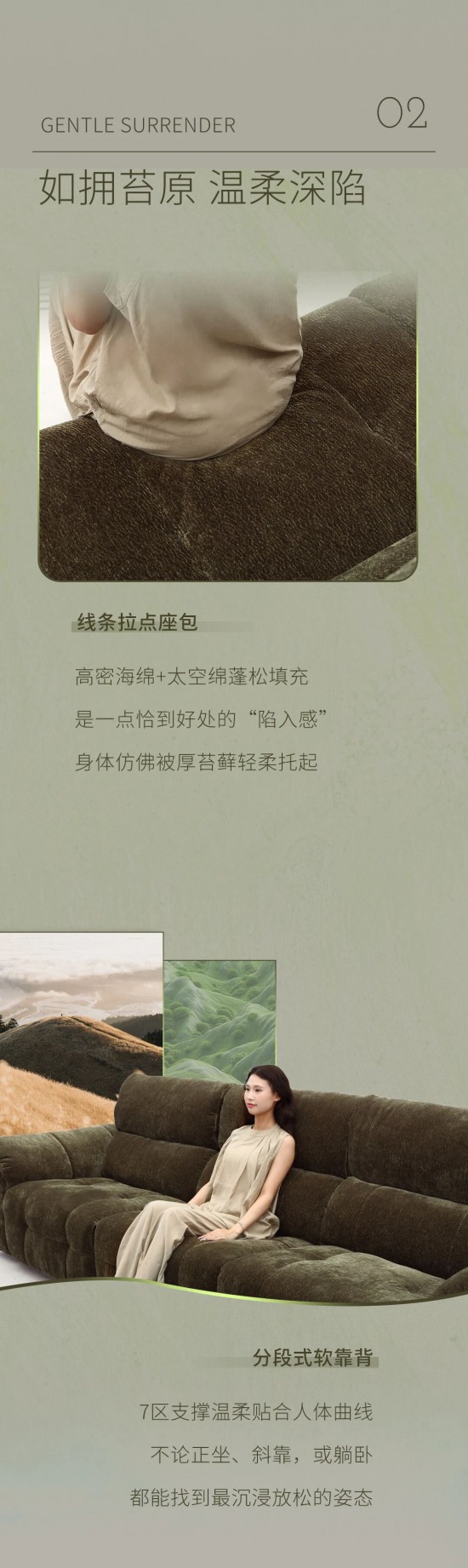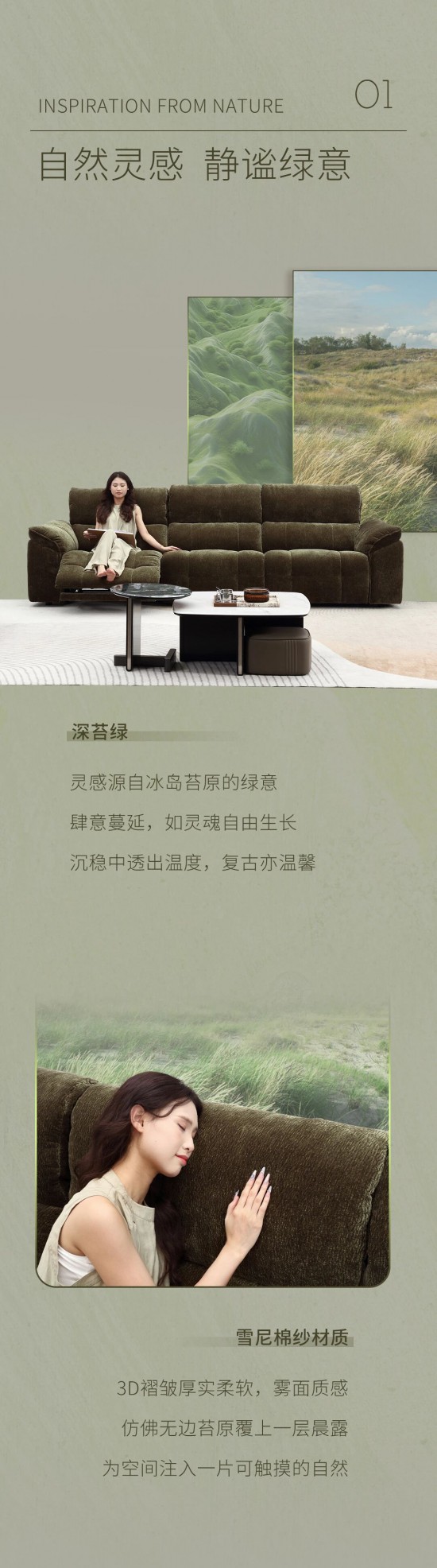 核心提示:深苔綠沙發(fā),靈感源自冰島苔原的綠意,肆意蔓延,如靈魂自由生長,沉穩(wěn)中透出溫度,復(fù)古亦溫馨。