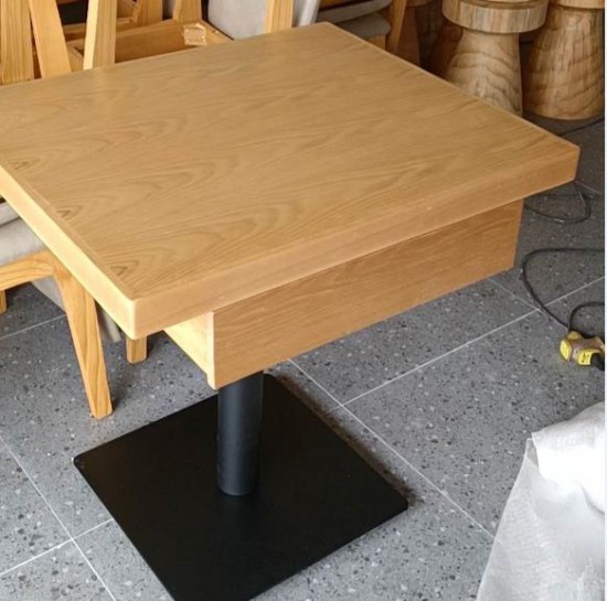 木桌子是夾板貼水曲柳面板,經(jīng)40噸冷壓機(jī),高壓壓平整,后經(jīng)5mm白臘實(shí)木封邊,原木色PU環(huán)保油漆處理,桌面防水清潔.桌面底部為啞白色,帶450*250*120mm活動(dòng)抽屜.可放紙巾,筷子,牙簽。8mm黑色防銹鐵板桌腳底盤(pán)配黑色防銹76mm管.