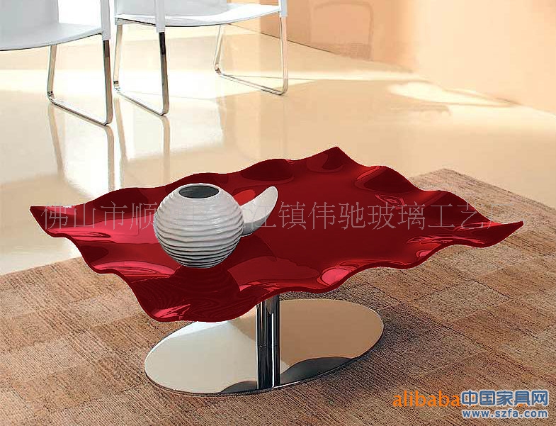 供應(yīng)歐式高檔玻璃茶幾,桌面為熱彎玻璃的紅色茶幾,五金玻璃茶幾