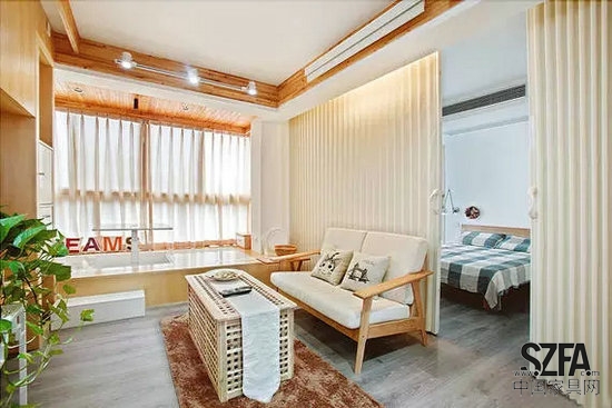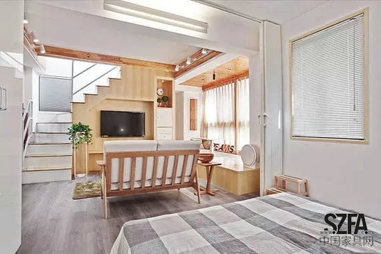 小戶型雙人沙發(fā)背后,便是開放式臥室,當折疊門打開時,主人可以很方便地在床上觀看影片。來客時,折疊門一關,臥室風光自然遮掩不可見了。