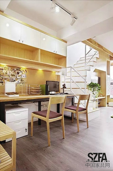 書房無隔斷,緊靠樓梯而設,墻上的書柜提供充足的儲藏空間,溫馨的木色配上隱藏式小射燈,即使是在夜深人靜的時候也有一份舒適祥和的讀書氛圍。
