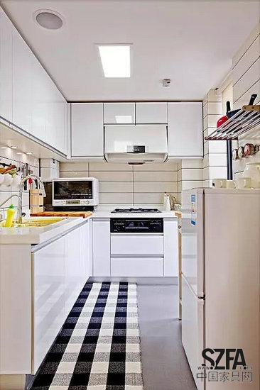 廚房雖小,卻擁有一扇不小的窗戶,良好的采光讓廚房變得明亮。L型櫥柜特意挑選白色烤瓷面板,反射性較強,提升空間的明亮度。