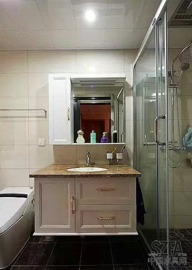 衛(wèi)生間之一,簡歐式的洗手臺和衛(wèi)浴柜提升了整體格調,充足的柜子保證了小衛(wèi)生間的收納需求。