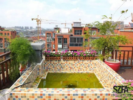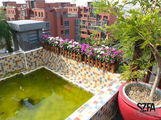 花園里用馬賽克鋪設出一個小水池,養(yǎng)些金魚可以陶冶情操