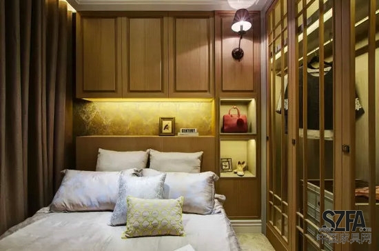 由于空間的限制,次臥房床擺放于靠窗,呈現(xiàn)不對稱的設(shè)計,并使用壁燈的燈光來平衡床頭板的面積,由于壓梁,設(shè)計上方收納柜來掩飾結(jié)構(gòu),大大增加了儲存空間。