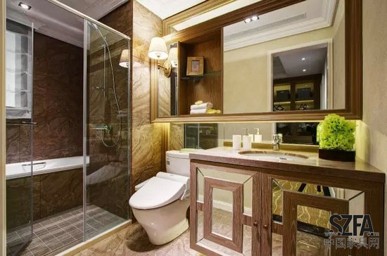 主臥浴室采用進口石英磚代替大理石,利用鏡面反射讓5.3 m²的空間整體顯得更大也呈現(xiàn)出高雅的私人放松空間。