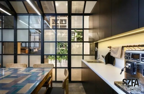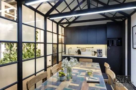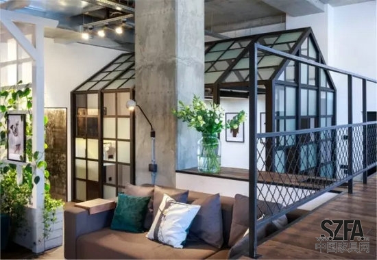 因?yàn)榭臻g的高度足夠高,設(shè)計(jì)師就勢(shì)采用了一種屋中屋的設(shè)計(jì)方案。例如,廚房被安置在玻璃房里,而休息區(qū)的位置則在藤架做成的綠廊下面。休息區(qū)的周圍都是高大的綠葉植物,坐在這里就好像是呆在城市花園里一樣。用金屬框架和不同種類的玻璃做成的玻璃房,既具有一定的造型,又顯得清晰明朗。