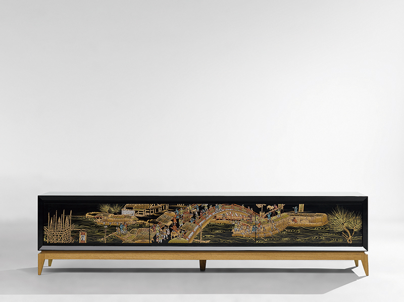 清明上河圖邊柜,是物本造2014年最新系列“Neweast Artdeco”之一。作品選用清明上河圖的局部畫面作為柜子的主題,配以現(xiàn)代形體,加上黑色鋼琴漆讓整個(gè)作品時(shí)尚中透著中國(guó)特色;淺色的貝殼流蘇既強(qiáng)化了主題風(fēng)格又為點(diǎn)睛之筆,北美橡木腳在整體中起到了既反差又呼應(yīng)的作用,同時(shí)也提升了作品在材料上的質(zhì)感。