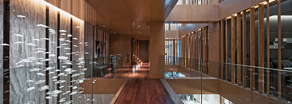 Leisure and recreational functions were allocated at the basement1 and 2 levels with good acoustic control. Double height central area under the swimming pool structure with suspended copper tube LED lights gave the party area underneath a starry night effect. It depicted the beauty of nature again and set a romantic scene for the reading area wine cellar mini theatre and gym at the periphery.