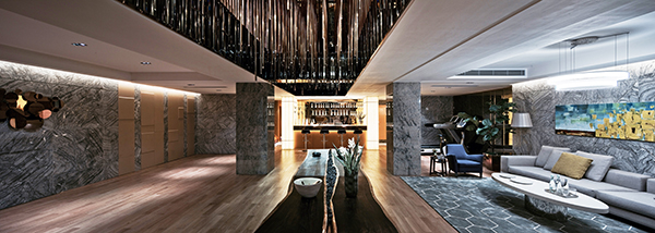 優(yōu)閑和娛樂功能座落在負一二層,具備更佳的隔音效果中庭泳池區(qū)底部兩層高中空上方掛有銅管LED,為這派對空間呈現(xiàn)出星光燦爛的宴會氣氛,再度繪出了大自然的景致之美,賓主在浪漫的氣息中進行閱讀,品嘗美酒,觀看影劇和修身健體渡過歡樂時光