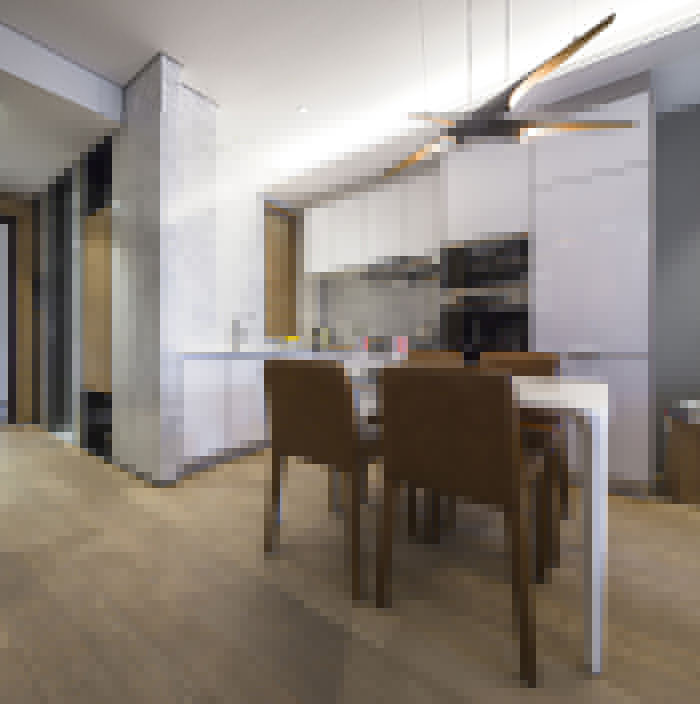 空間內(nèi)簡潔明快的設(shè)計(jì),材料的選用,家具飾品的點(diǎn)綴,溫馨又優(yōu)雅。開放式的廚房讓空間開敞明亮。餐客廳與玄關(guān)大量使用石材、木飾面,嵌入黑色金屬材質(zhì),讓原本零碎的空間融為一體。