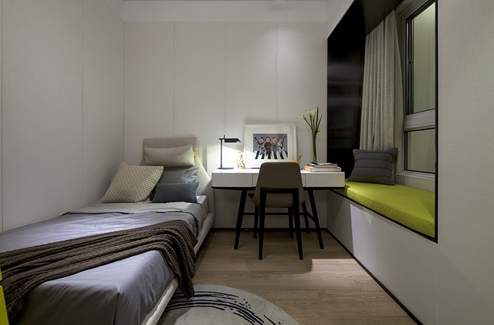 次臥在簡約的色調(diào)上搭配跳躍的橄欖綠,簡約而又不死板。