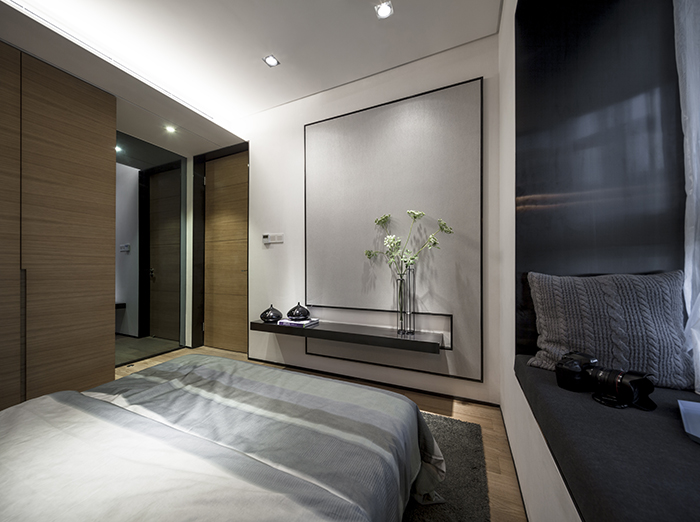 主臥的整體色調(diào)柔和,符合臥室靜謐舒適的基本要求。由于空間的限制,設(shè)計(jì)師在入口處采用了大面積灰鏡,在視覺上放大了臥室空間,讓主人的居住更加舒適。