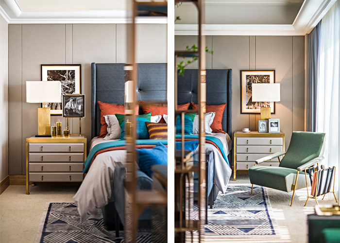 走上二層,可以看到一個個色彩平衡、層次豐富的臥室空間。米色和咖啡色系是這里最經(jīng)典的色彩基調(diào)。在這個基調(diào)上,設(shè)計師利用不同層次的橙色和藍色融入,一會輕快、一會沉穩(wěn),為不同的主人營造韻味十足的私密空間。