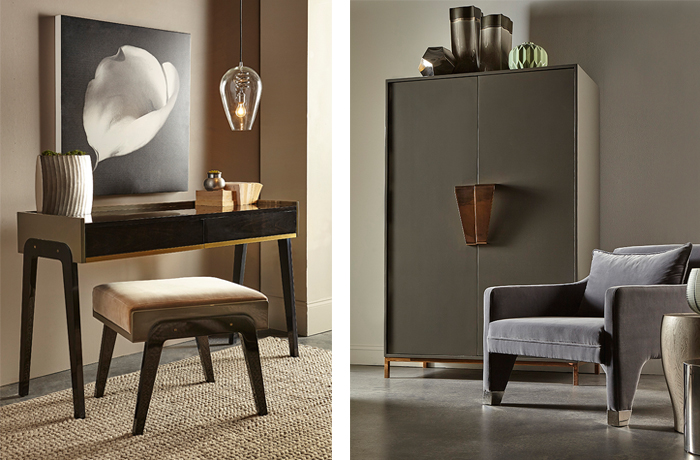 中性色調(diào)的灰褐色儲(chǔ)蓄柜以不銹鋼材質(zhì)作為主要材質(zhì)配搭玫瑰金色調(diào),加深了產(chǎn)品的韻味。拋光的金屬色包含了玫瑰金、鎳、銅、黃銅,不銹鋼配搭上磨砂玻璃、實(shí)木材質(zhì)及有顏色的噴漆,整體系列聚焦著時(shí)尚感。The Vinci 椅混有玫瑰金的框架以及木制扶手,散發(fā)著一種精致的豪華感,線條與有機(jī)的紋理形成有序的質(zhì)感。