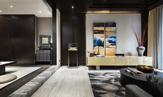 順著樓梯循級而下,6米長的云石吊燈光影如泄,石屏上幻化的肌理,猶如一幅幅精美山水畫,順著山水的紋路,透出朦朦朧朧的光如數(shù)千年的文化長河,傾瀉于底下的一組太湖石之上。