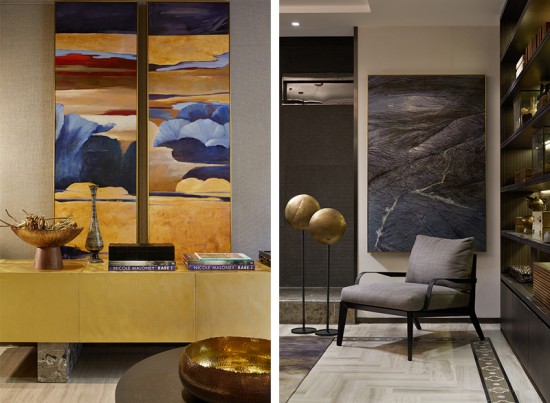 大面積的金箔畫與靜氣內(nèi)斂的深色系為主臥渲染基調(diào),銅器的光澤穿插點綴,透過鏤空的木質(zhì)屏風(fēng),漏下了點點滴滴的夕陽余暉,映照在濃綠的枝葉,將臥室書寫出了庭院的意趣。