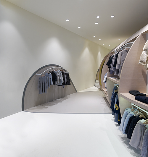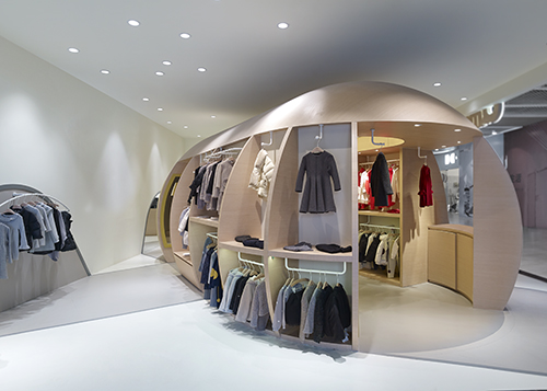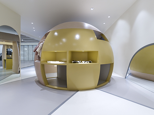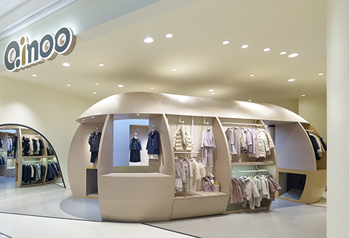 通過運用一個欲破土而出的巨型“種子”,圓形設(shè)計憨態(tài)可掬,給人留下深刻的品牌形象,吸引成人與兒童一同走進店內(nèi)探索其奧妙。形象鮮明的“種子”不僅在視覺上引人注目,功能上還融合了展示、銷售、儲藏等。不同人群的不同活動模式,如挑選、試衣或者收銀等,被種子元素聯(lián)系起來。