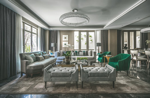 設(shè)計以玉石之王翡翠的色彩,應(yīng)用于灰色的主調(diào)空間,以豐富的家居配飾元素、鮮明的色彩層次及質(zhì)感的材料運用,呈現(xiàn)了浪漫、靈動的空間之美,讓這個五層的別墅呈現(xiàn)了絕美風(fēng)華。