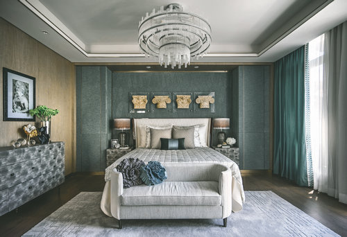 二層、三層為不同主人的臥室空間,均以營造靜謐為前提,用不同程度的灰色糅合現(xiàn)代風(fēng)尚,在內(nèi)斂與品質(zhì)之外,加入異域元素的融入。家庭廳在舒適和藝術(shù)之間達到共振,圓形沙發(fā)與白色皮質(zhì)單椅的圍合,讓家人相處的時間融洽自然,墻面掛飾稍作點綴,地毯仿佛一幅裝飾畫,大面積提升空間的裝飾感。主臥休息室主調(diào)為灰色,整體空間莊重內(nèi)斂,銅質(zhì)飾品的介入,形成一脈形成的藝術(shù)感。主臥的設(shè)計中,設(shè)計師將古舊粗獷的古羅馬建筑元素提煉成了床頭的藝術(shù)裝置,用精巧的方式將宏大的敘事載入空間,克制的色系與浪漫的表達形成了東方和西方的對話。次臥用不同程度的灰色糅合現(xiàn)代風(fēng)尚,特殊定制的亞克力床頭和邊柜,空間中的掛畫、飾品以簡潔的形式呈現(xiàn),極致的簡練和輕盈的浪漫并存。男孩房以精致的格紋與幾何線條的延伸界定了空間的格調(diào),歐洲建筑圖案為背景的單椅和精心布置的藝術(shù)品,讓空間更具情景化,純真浪漫。書房中,簡練的色調(diào),奔放的斑馬紋地毯與精致的皮藝形成視覺上的張力,凸顯經(jīng)典與現(xiàn)代的交織感。