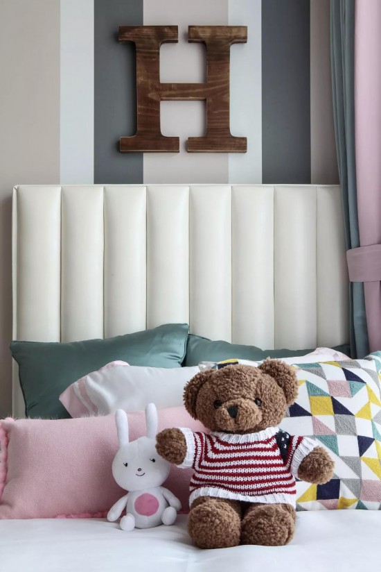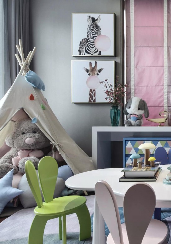 在女兒房設(shè)計(jì)中,經(jīng)由馬卡龍色調(diào)的清甜組合,一個(gè)甜美溫馨的童話樂(lè)園于此誕生,柔軟溫暖的的拼布地毯上,安放著粉白相間的小床,可愛(ài)的動(dòng)物們相伴左右,一切的一切,仿佛都在共同制造著童年輕快的幻夢(mèng)。一個(gè)浪漫的水晶飾品吊燈,散發(fā)出純凈通透的光,讓甜蜜浪漫在空間縈繞著。