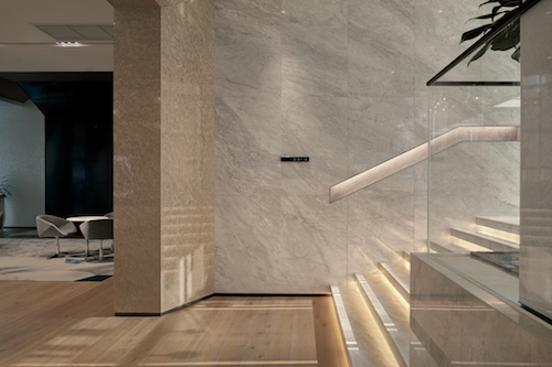 淺色的大理石色調使整體空間具有雅致、簡潔、干凈的氛圍。在連接一層和二層空間的踏步式樓梯,大理石墻面模擬扶手扶梯的形狀,設計了隱藏式的燈帶,臺階下方同樣使用了隱藏燈帶,既保證了客人上下樓的安全,又增添了空間的藝術氛圍。