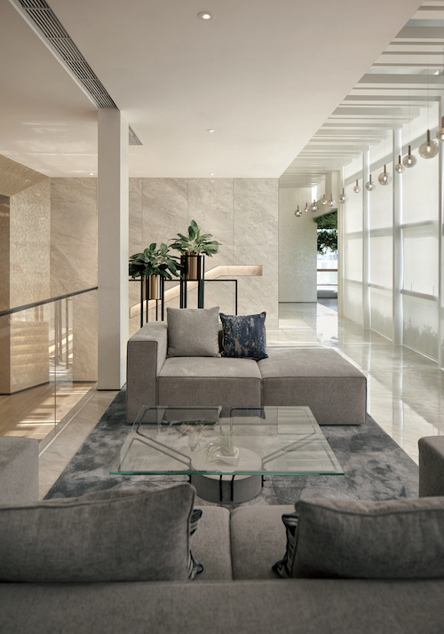 一樓洽談區(qū)告別常規(guī)風格,利用柱位作為設計的延伸,大理石隔斷墻劃分出相對獨立的洽談空間,在尊重客戶隱私的同時,避免洽談氛圍的尷尬。全景式的玻璃墻具有很強的透光功能,讓洽談者在聊天時擁有開闊的視野和愉悅的心情。于玻璃墻的邊緣鋪設一排鵝卵石,將大自然的事物引入室內,起到和室外美景的完美銜接。