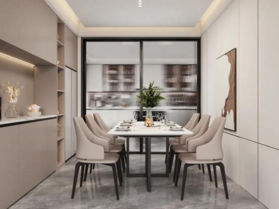 餐廚空間以長(zhǎng)虹玻璃隔斷,通透性十足。米色入墻柜,集實(shí)用性與美觀性于一體,豐富空間功能。CBD家居·黑金 | HZ206餐桌,天然爵士白桌面提升空間質(zhì)感,方形四角圓弧處理,溫柔呵護(hù),打造舒適溫情的用餐時(shí)光。