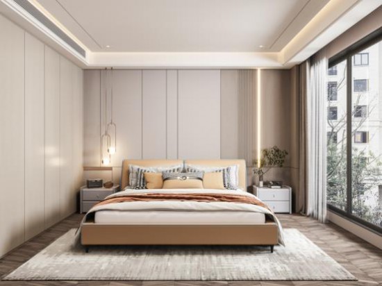 空間被淺灰咖的溫馨感包裹,大片落地窗是點(diǎn)睛之筆,引景入室,得到更適意的生活體驗(yàn)。CBD家居·黑金 | HZ018軟床,橡木黃色如陽(yáng)光一般,讓臥室充盈自然暖意,細(xì)節(jié)處間以藍(lán)色線條點(diǎn)綴,彰顯生活的精致感。