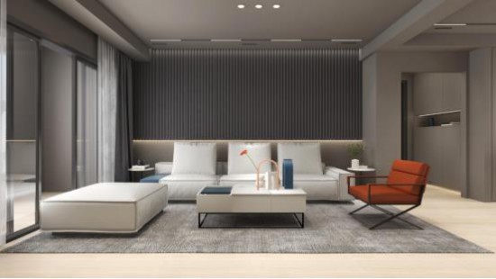 深灰色格柵背景墻內(nèi)設(shè)燈光,提升整體空間的藝術(shù)感與精致度,CBD家居·黑金 | HZ129沙發(fā),米白色舒緩柔和,渲染出愜意而舒適的意境,簡雅方正的形制,整齊有序的圍合布局,凸顯空間張力,自在倚坐,得靜心閑適。
