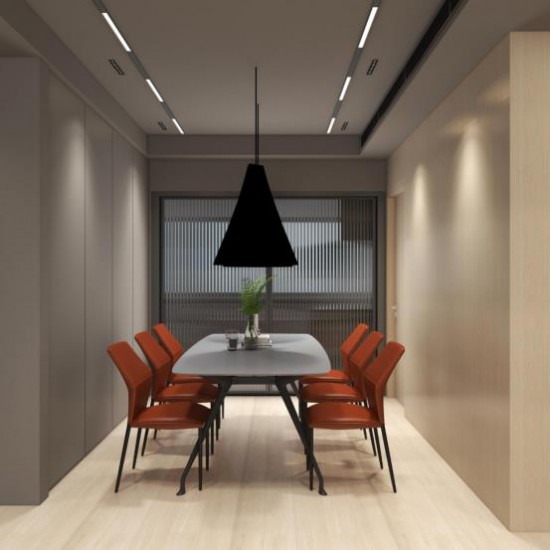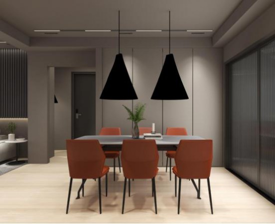 用餐區(qū)與廚房間以長虹玻璃隔斷,增強空間的互動性,方寸之間,充滿活力暖橙色的餐椅106將空間氛圍感拉滿,豐收美滿的寓意,平凡生活里的煙火氣。