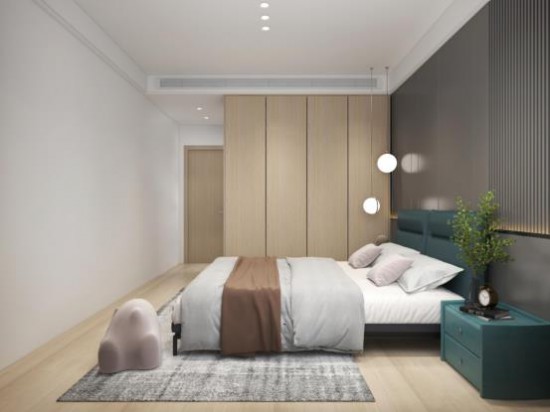定制柜延續(xù)自然的木色,與莫蘭迪灰背景墻呼應,主臥空間更顯溫潤優(yōu)雅。圓形吊燈如皓月當空,增加空間的詩性,奠定舒緩的睡眠氛圍。