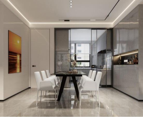 橫向考慮的話,設(shè)置落地窗能有效增強(qiáng)室內(nèi)采光,以及將客廳、餐廳、廚房打通成一體化空間,增強(qiáng)互動(dòng)性,也強(qiáng)化了整體的空間感。另外整體空間里要避免實(shí)體隔斷,鏤空柜、玻璃都是不錯(cuò)的選擇。