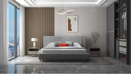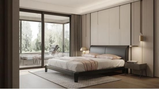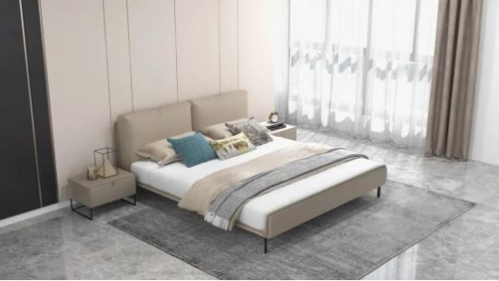 臥室空間里,一張CBD家居·黑金 | HG002軟床,淺灰色奠定靜謐舒緩的睡眠氛圍,獨(dú)立大靠包飽滿軟彈,齊邊框加擋邊式床尾設(shè)計(jì),節(jié)省空間,穩(wěn)固床墊,守護(hù)整夜安穩(wěn)好眠。