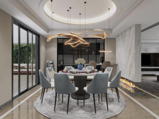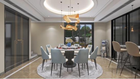 充分利用大空間的優(yōu)勢,懸空隔斷墻將客餐廚空間相互打通,賦予空間呼吸感,也讓采光更加充裕。圓形吊頂內設線燈,柔和燈光渲染溫馨的用餐環(huán)境,飄帶狀吊燈藝術范十足,自然起舞,點綴出空間的流動美感。
