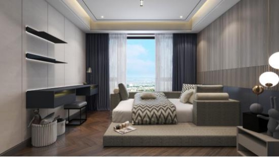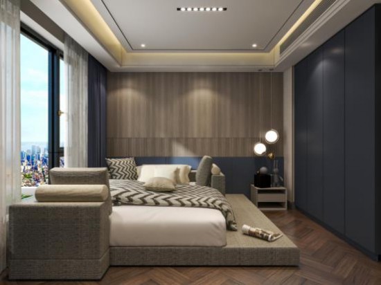 從視覺設計到空間功能性設計,主臥集陽臺、書房、休閑區(qū)于一體,美感與實用性達到融合,實現人與空間的靈活互動,品質生活就此展開。