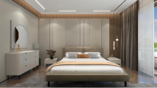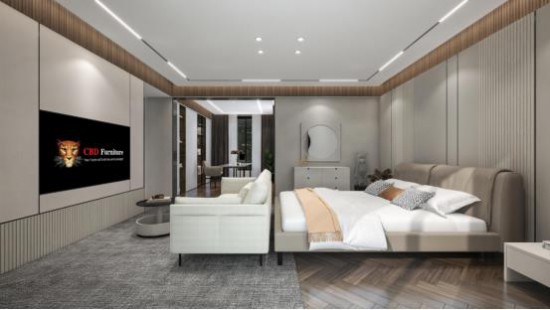 木棕色與灰色搭配的背景墻,沉靜而優(yōu)雅,CBD家居·黑金 | HZ019軟床的淺棕色與之呼應,低調溫暖,內嵌式床尾搭配五金高腳,通透空間,守護整夜好眠。