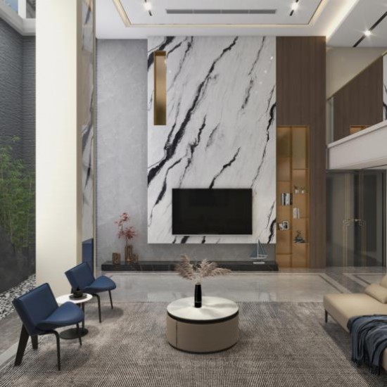 以空間尺度彰顯人生氣度,會客廳挑高設計演繹從容大氣的場域精神,大塊大理石背景墻垂直而下,水墨紋理飄逸自如,賦予空間詩意。
