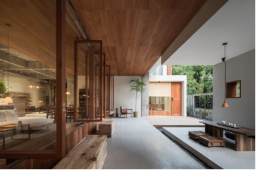 在南京展廳的呈現(xiàn)方式上,金鑫的設(shè)計(jì)打破了建筑的邊界,將室外空間與室內(nèi)空間交融互通,運(yùn)用美國櫻桃木將其結(jié)構(gòu)劃分出為不同的“盒子”,讓整個(gè)展廳沐浴在陽光與自然之中。臥室、書房、餐廳、茶室,都變成一個(gè)個(gè)獨(dú)立的個(gè)體,環(huán)繞在共享大廳周圍。